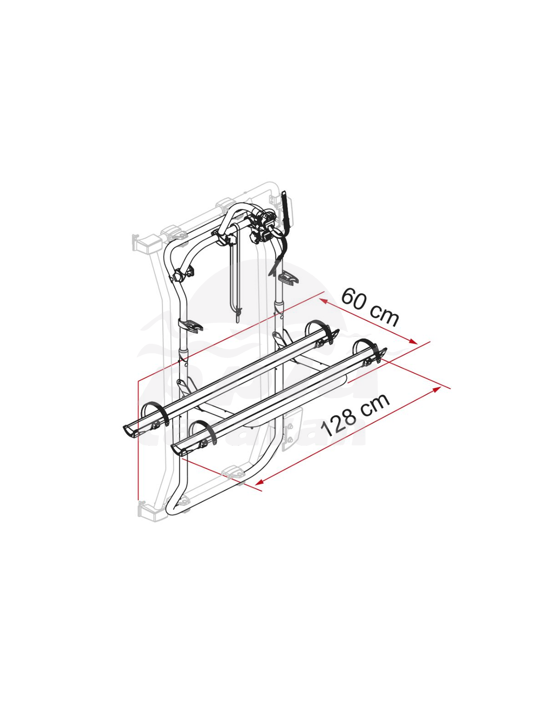 De 2 a 3 bicis (tercera opcional) / 2 E-Bike Repisa de acero inoxidable AISI 304 La configuración geométrica del Carry-Bike permite abrir el portón trasero del vehículo incluso con las bicicletas montadas Posibilidad de montar una escalera Deluxe en la puerta trasera izquierda