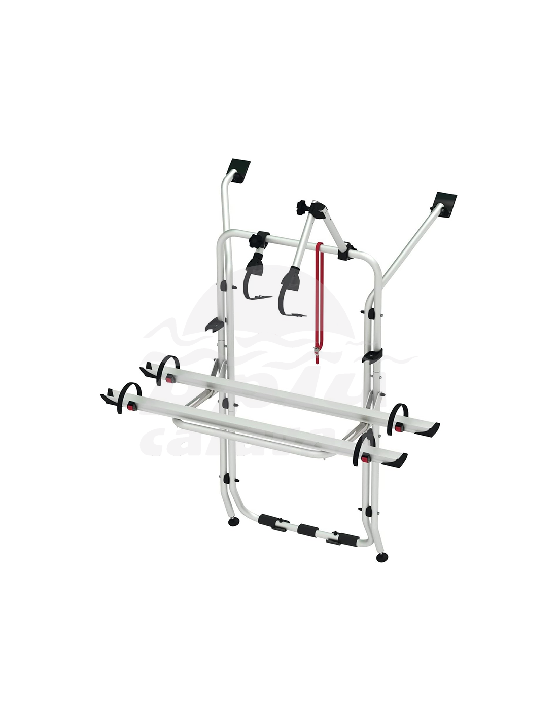 Se monta en la puerta trasera con soportes especiales incluidos en serie. De serie con 2 rieles. Fácil colocación de las ruedas mediante desplazamiento horizontal.