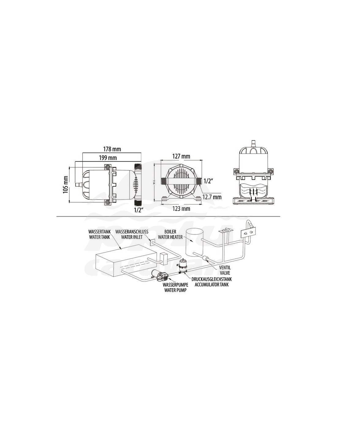 Con la ayuda del tanque de compensación de presión, el agua fluye silenciosa y constantemente, sin pulsaciones ni salpicaduras. Al reducir el tiempo de encendido y apagado, se prolonga la vida útil de la bomba de agua y se preserva la batería del vehículo.