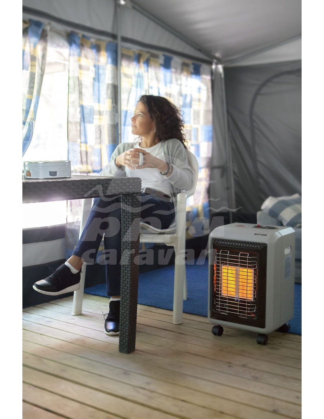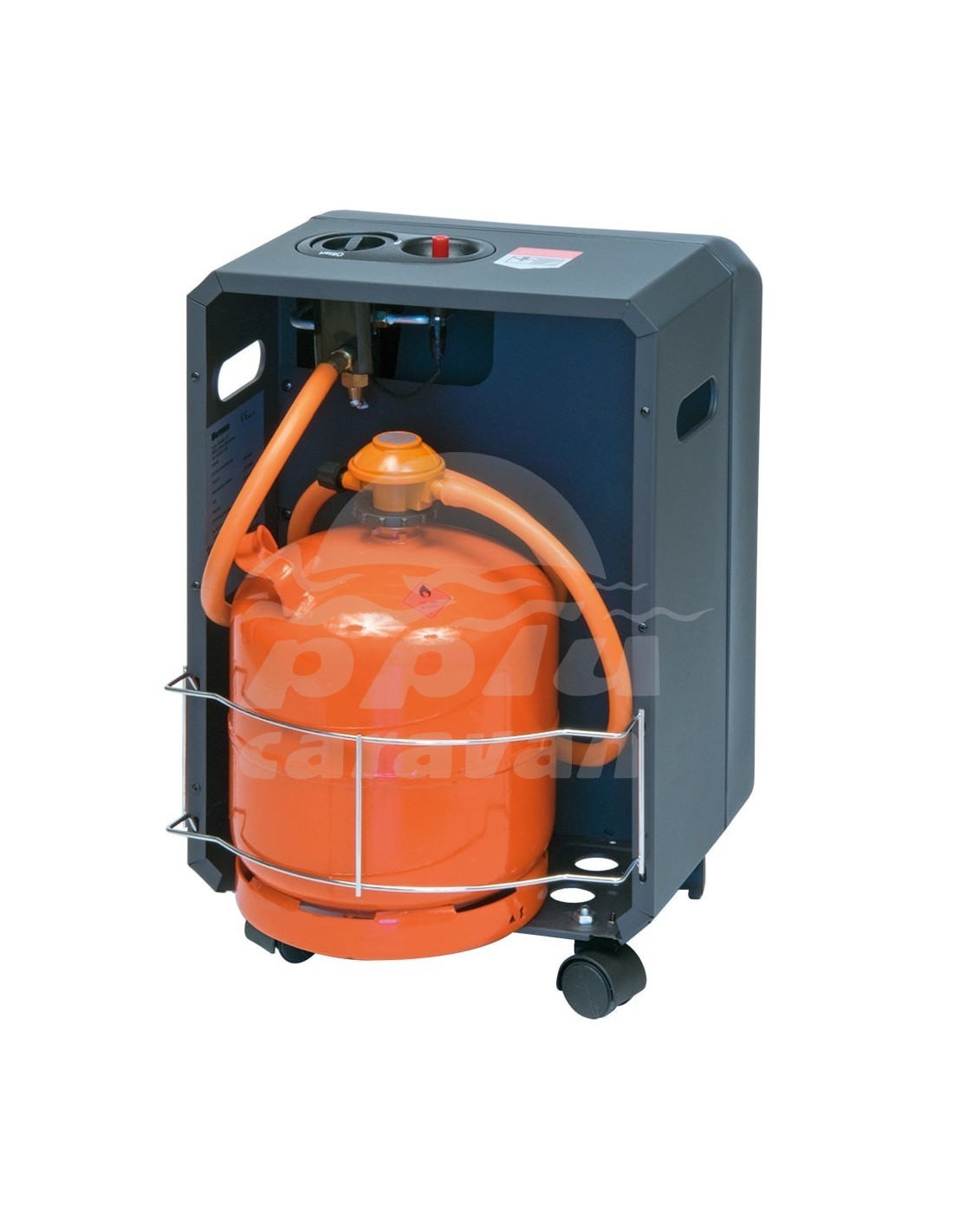 Gracias a su pequeño tamaño y a sus ruedas multidireccionales puede moverse donde convenga, incluso para calentar puntualmente en exteriores.