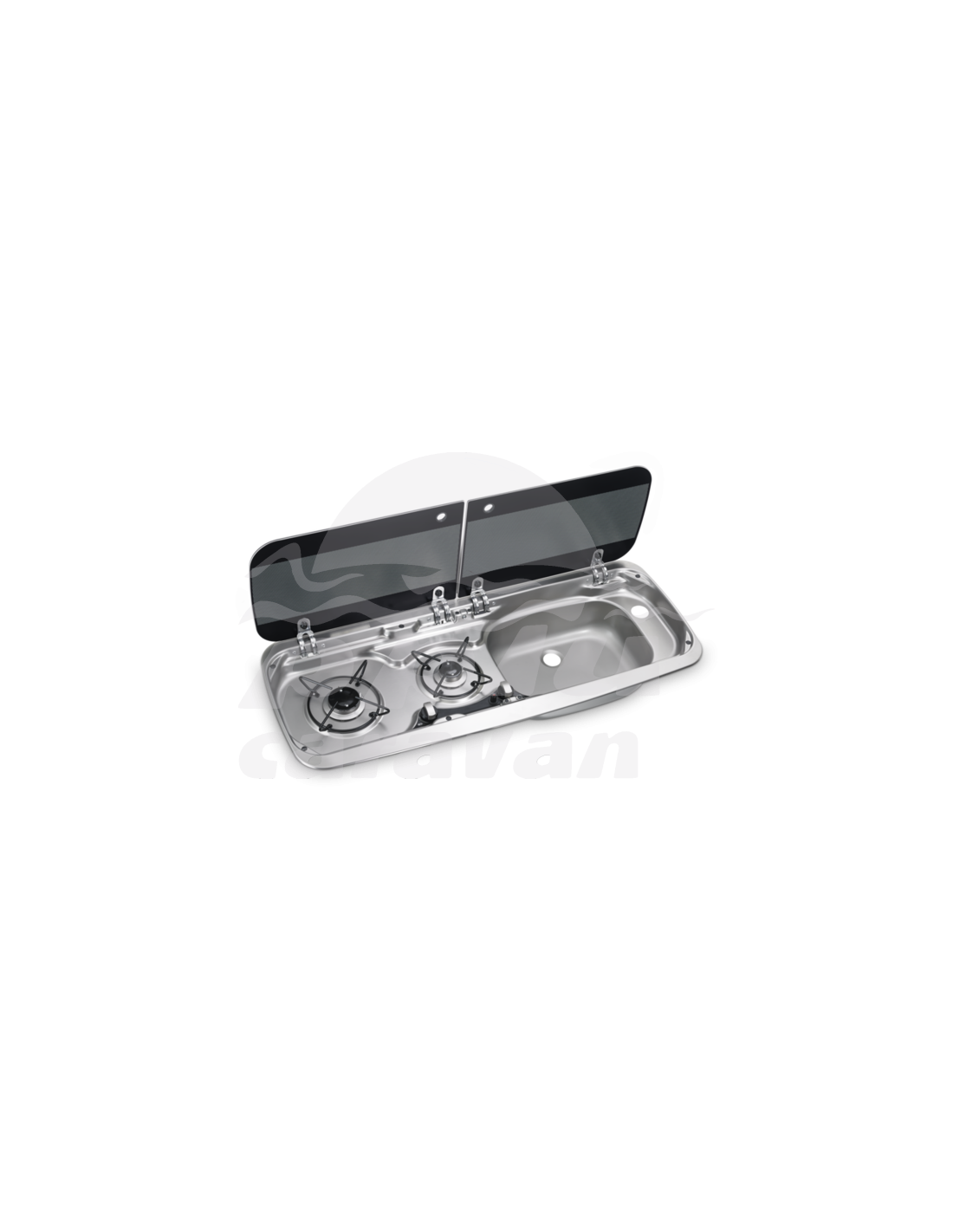 Placa de cocina compacta de dos fuegos y fregadero integrado situado a la izquierda, con práctica tapa de cristal de seguridad que proporciona espacio extra de trabajo cuando está cerrada.