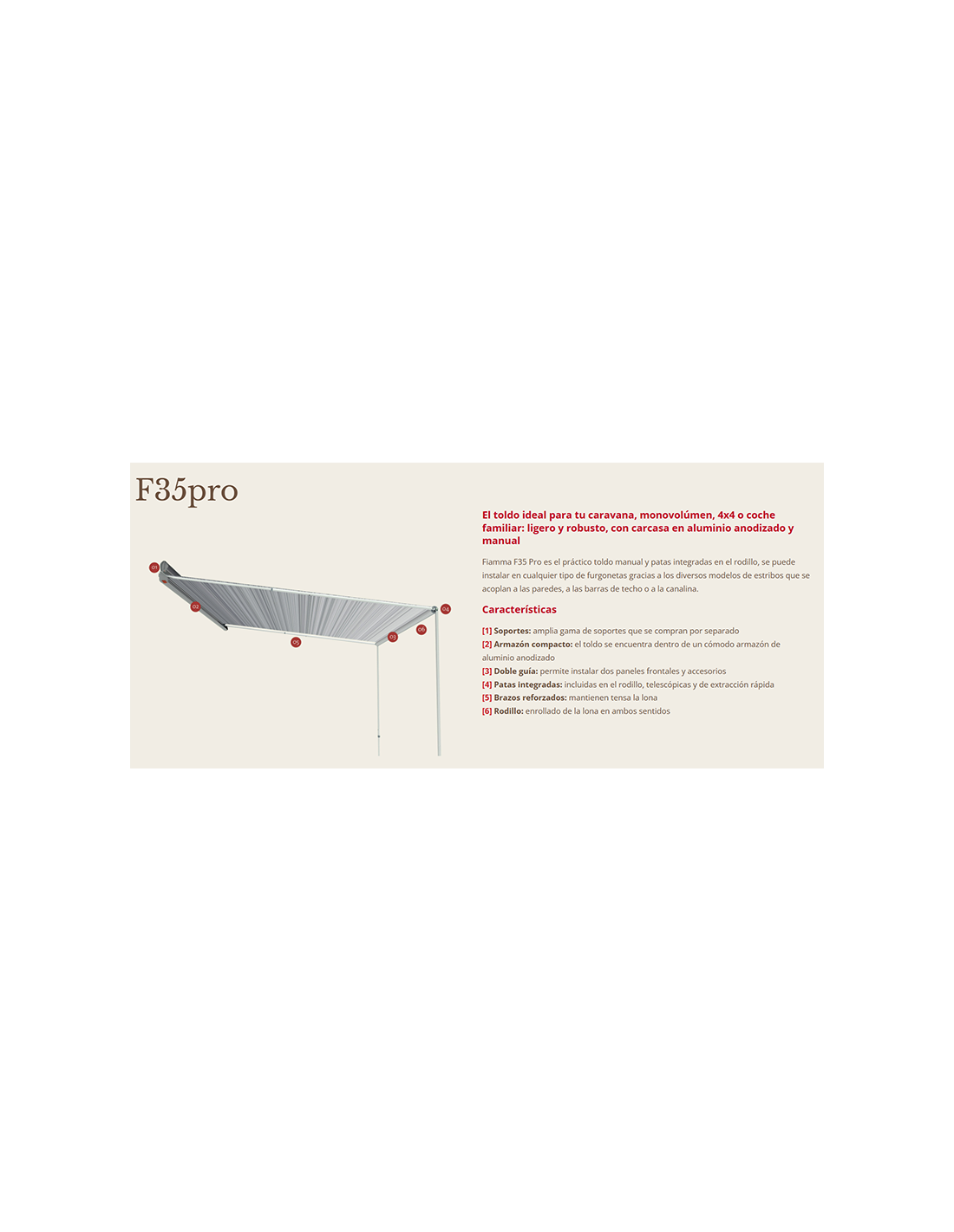 Fiamma F35 Pro es el práctico toldo manual y patas integradas en el rodillo, se puede instalar en cualquier tipo de furgonetas gracias a los diversos modelos de estribos que se acoplan a las paredes, a las barras de techo o a la canalina.