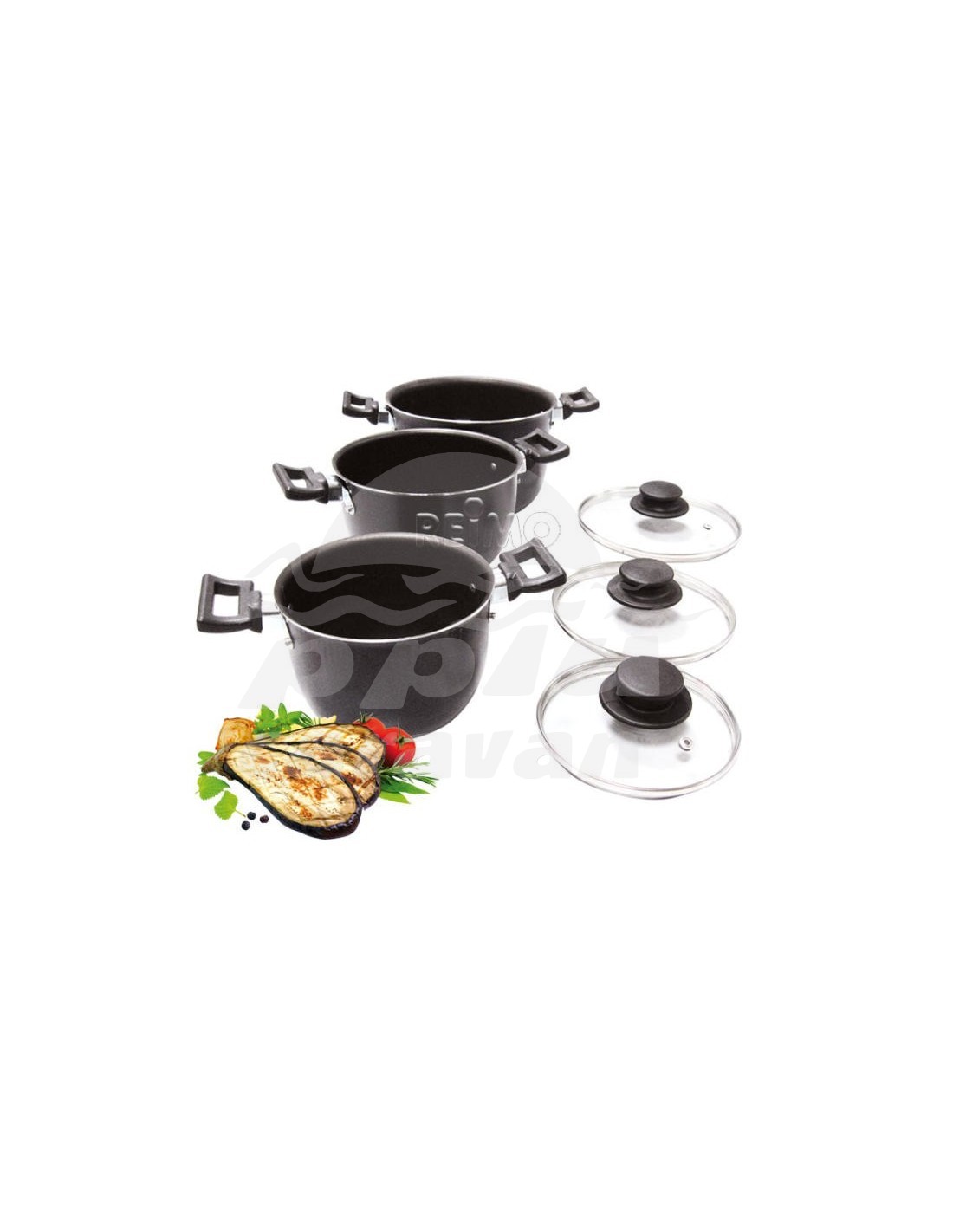 Con tapas, fabricado en aluminio gris oscuro. De 14-16-18 cms de diámetro.